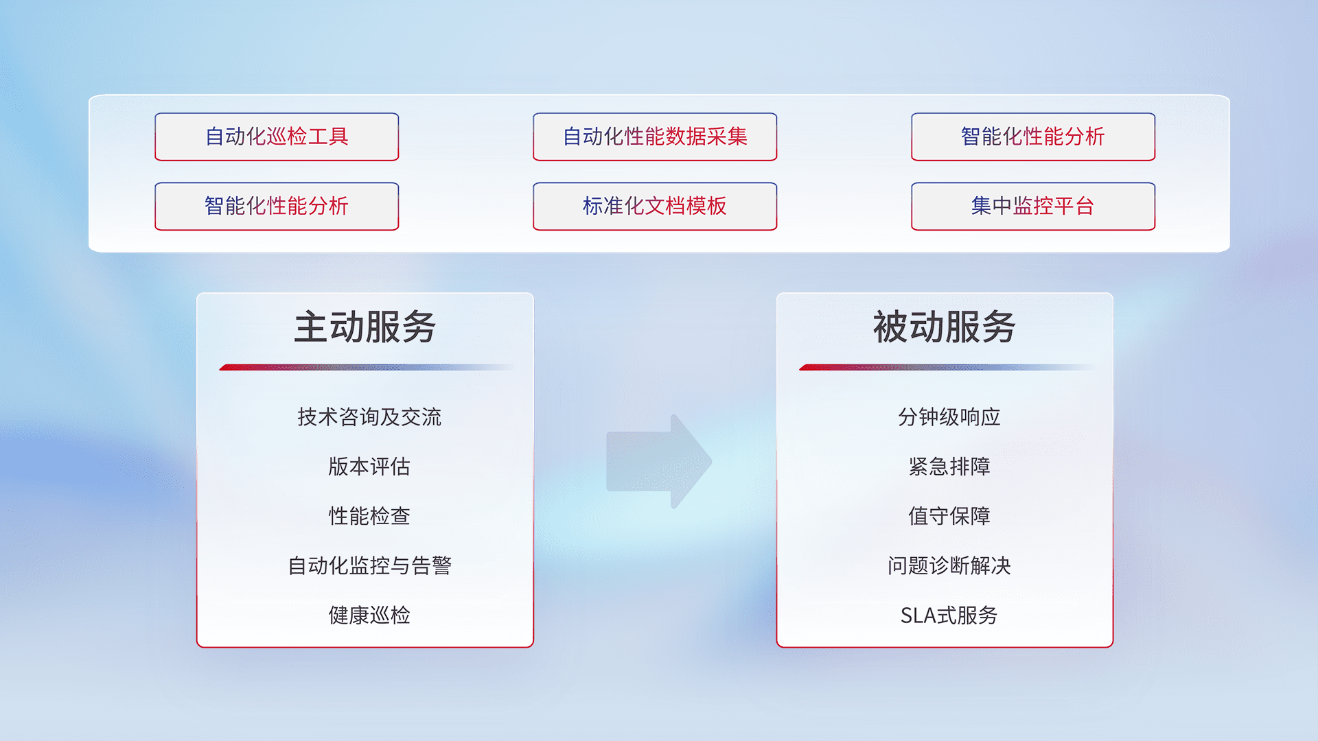 智能化工具和标准化文档,,保障服务质量,,提供主动服务(包含技术咨询、、版本评估、、、、性能检查、、、、自动化监控与告警、、健康巡检)和被动服务包含(分钟级响应、、、、紧急排障、、、值守保障、、、、问题诊断解决、、、SLA服务)。。。。