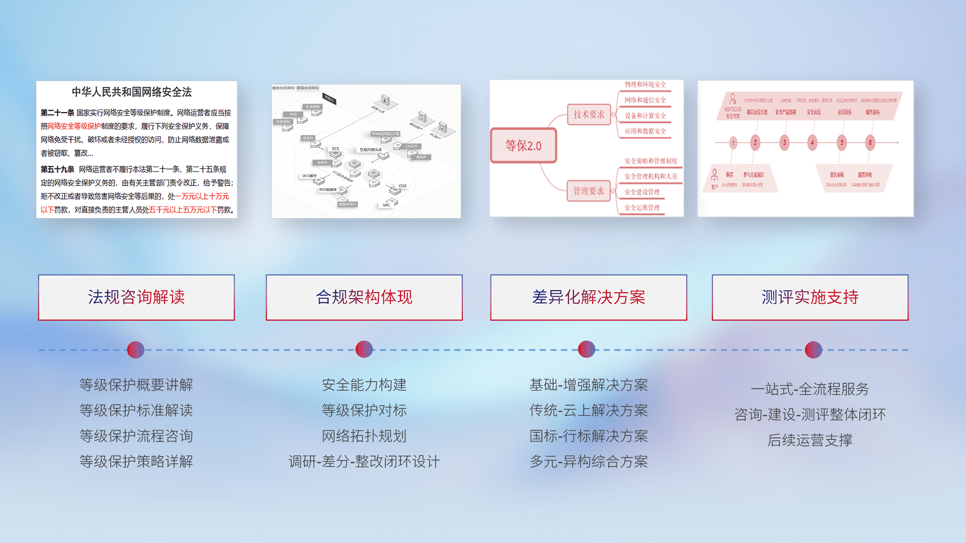 通过专业的法律咨询解读、、合规架构体现、、、差异化解决方案、、、、测试实施支持等服务,,,为客户量身打造等保合规体系。。。。